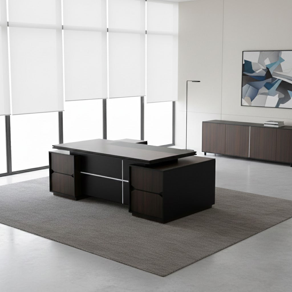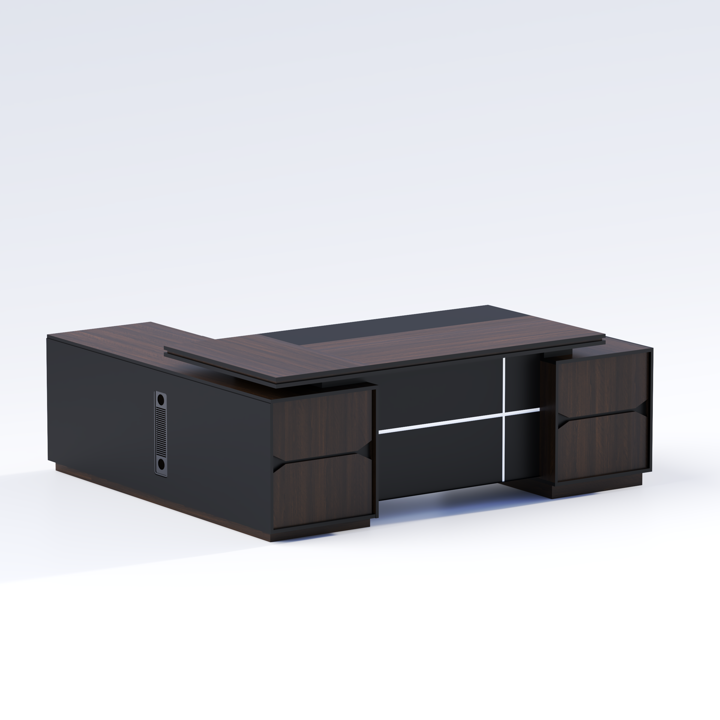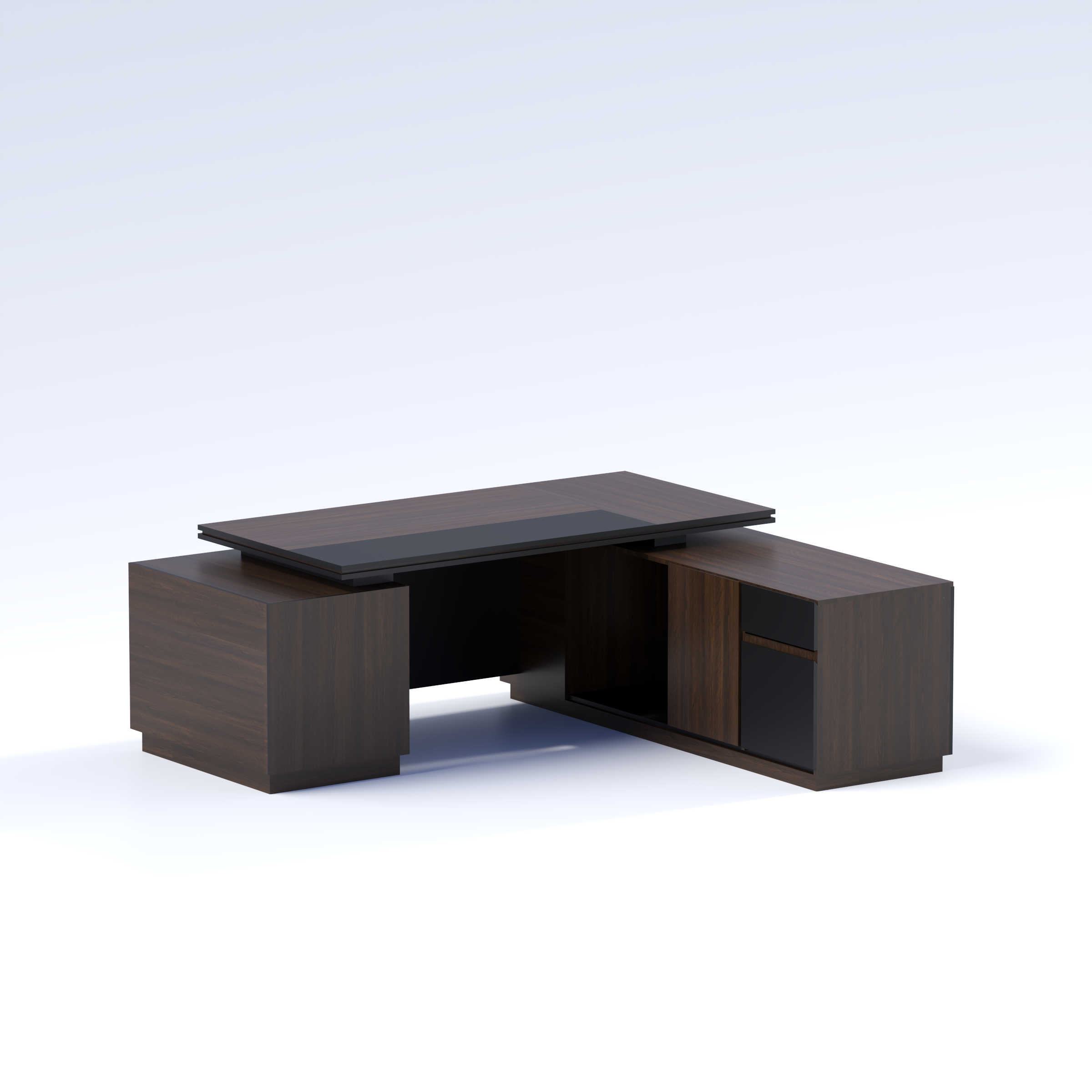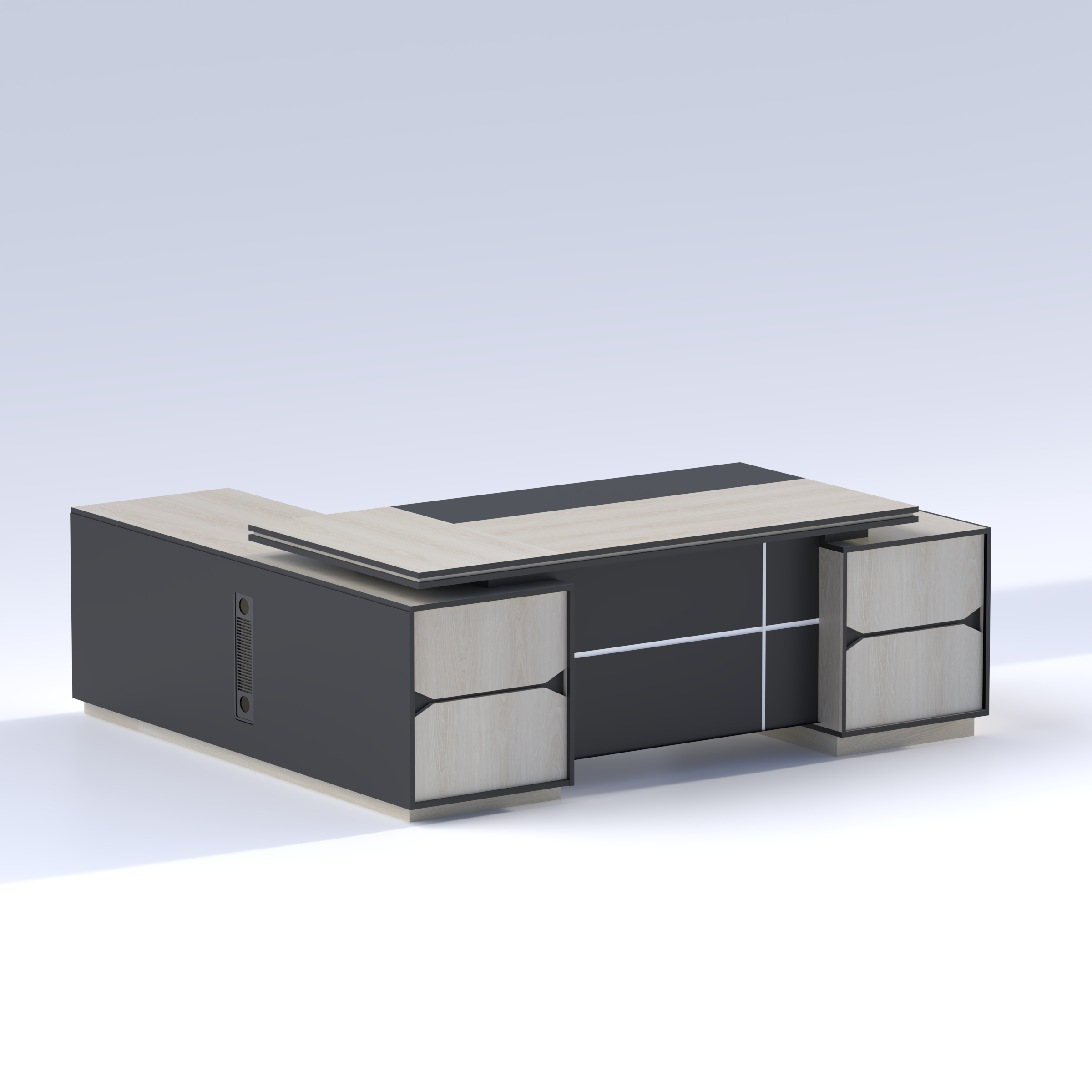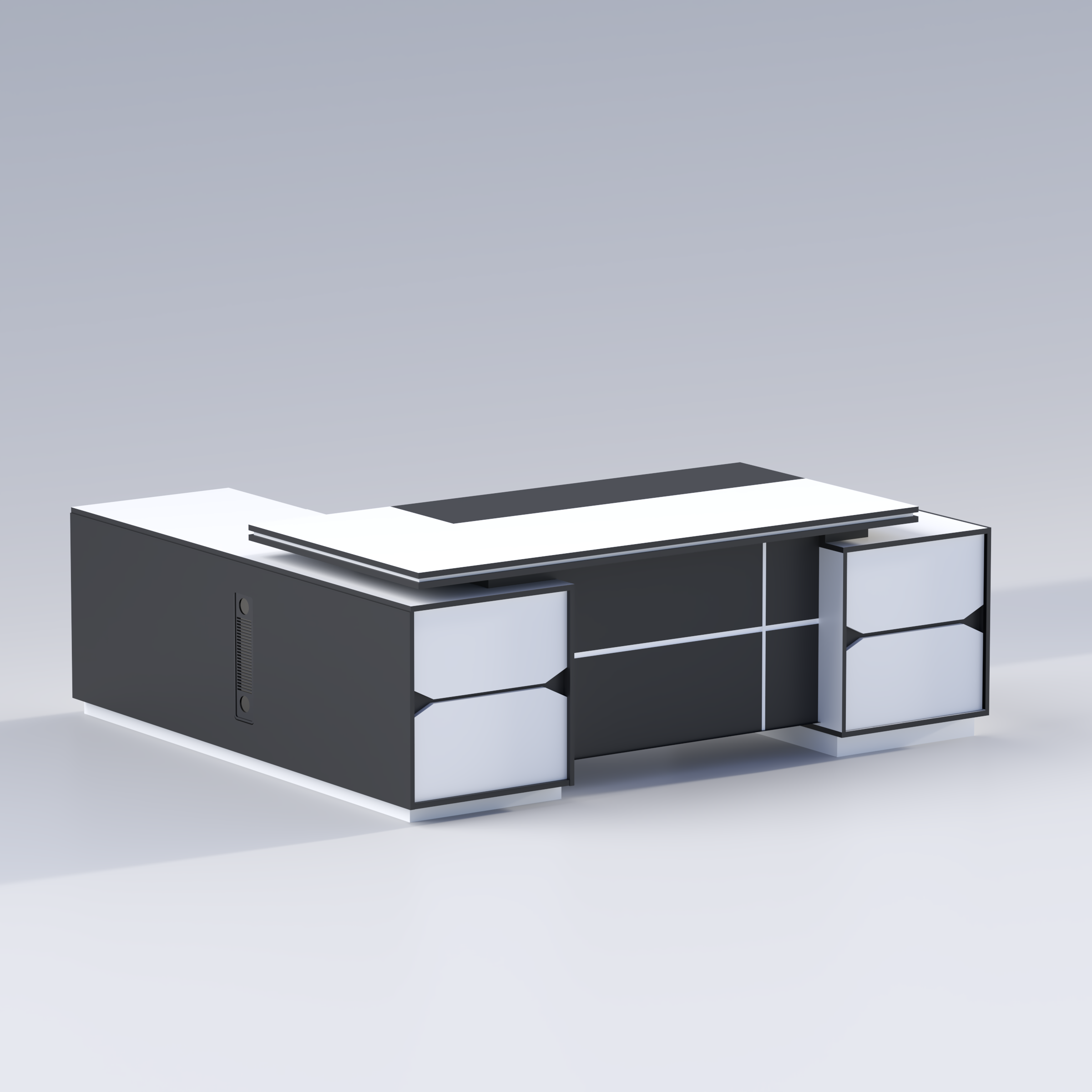 A wide, work‑friendly L‑shaped desk crafted for multitasking executives. Its generous dimensions allow placement of multiple monitors, documents, and office tools. The melamine surface ensures lasting performance in busy work environments, supporting productivity and organization.