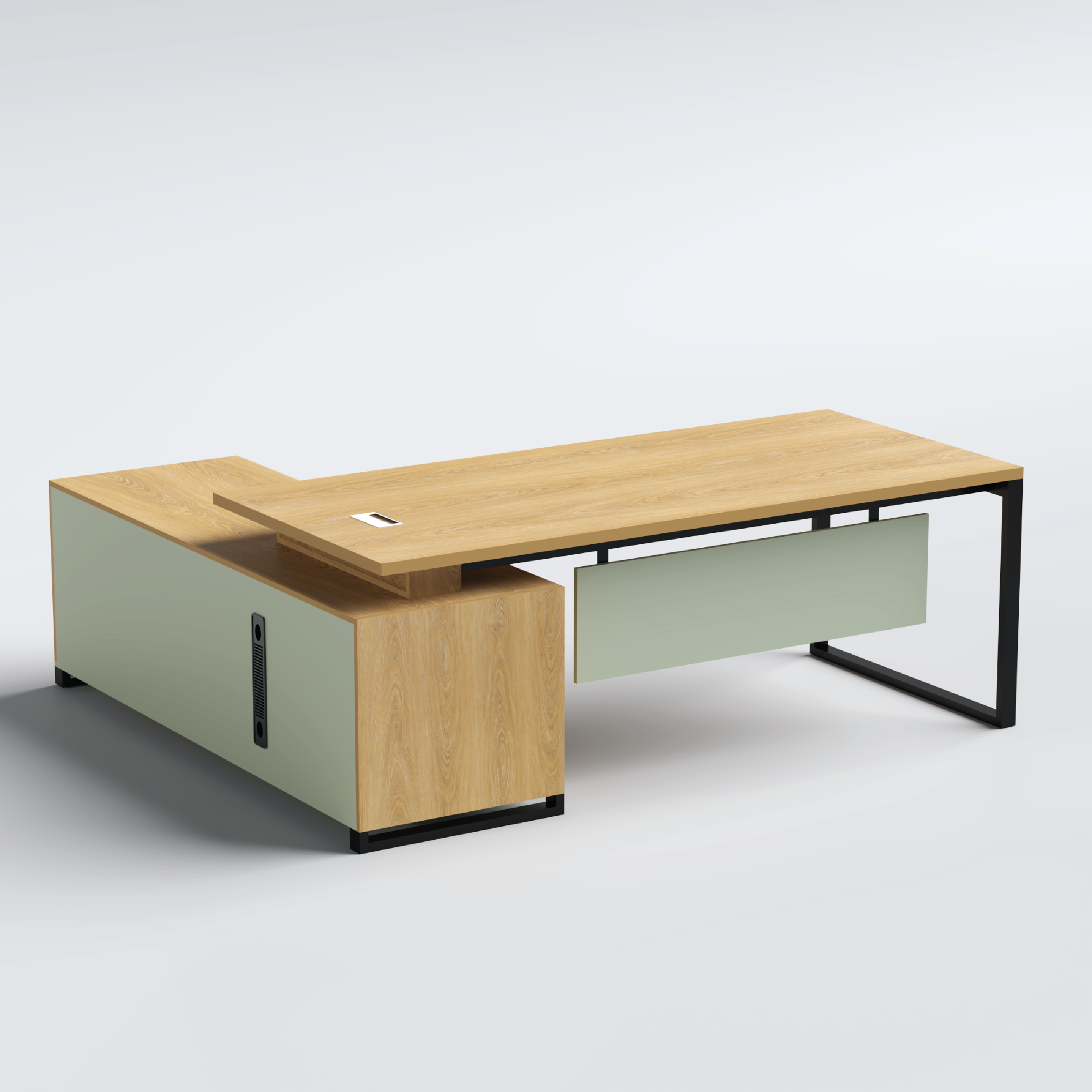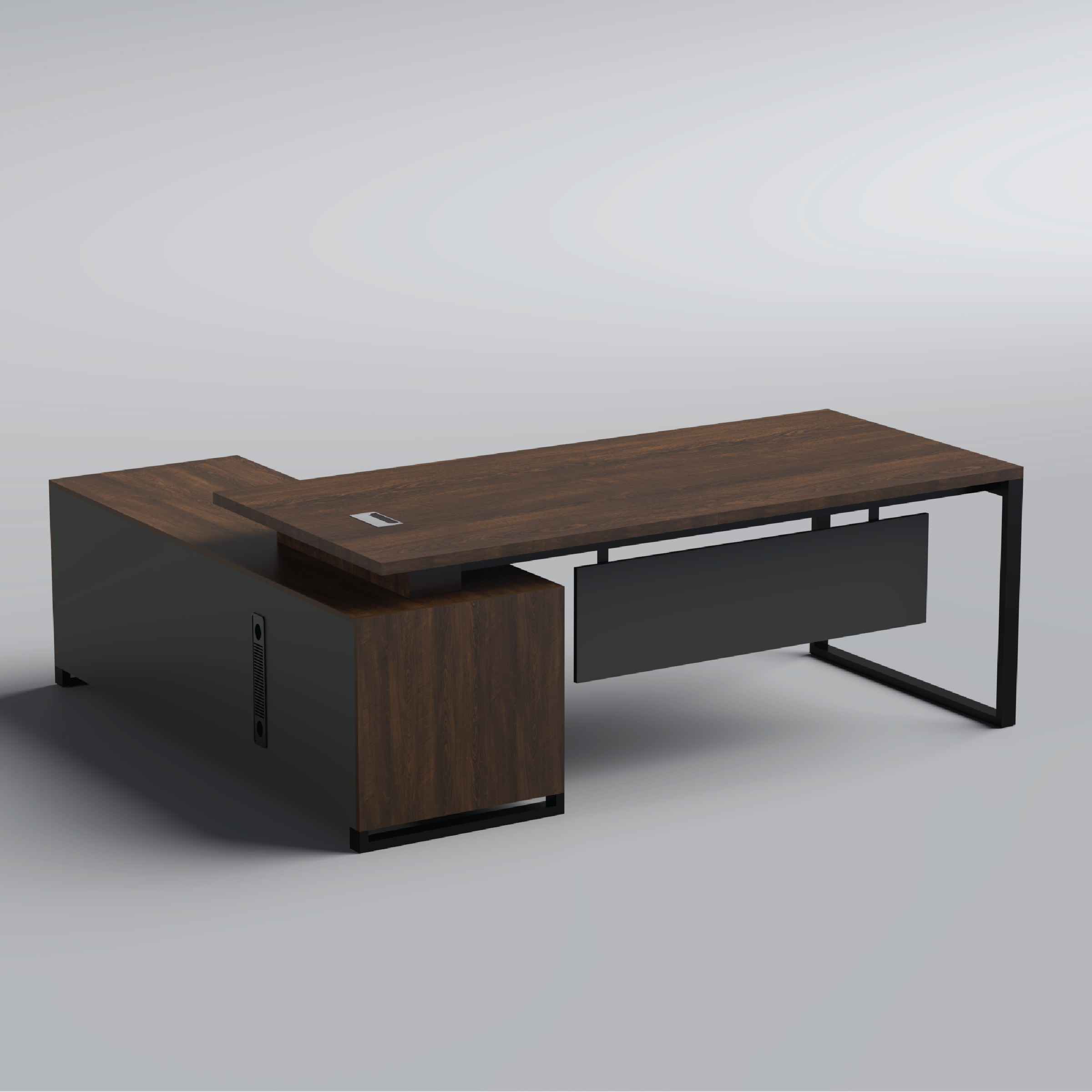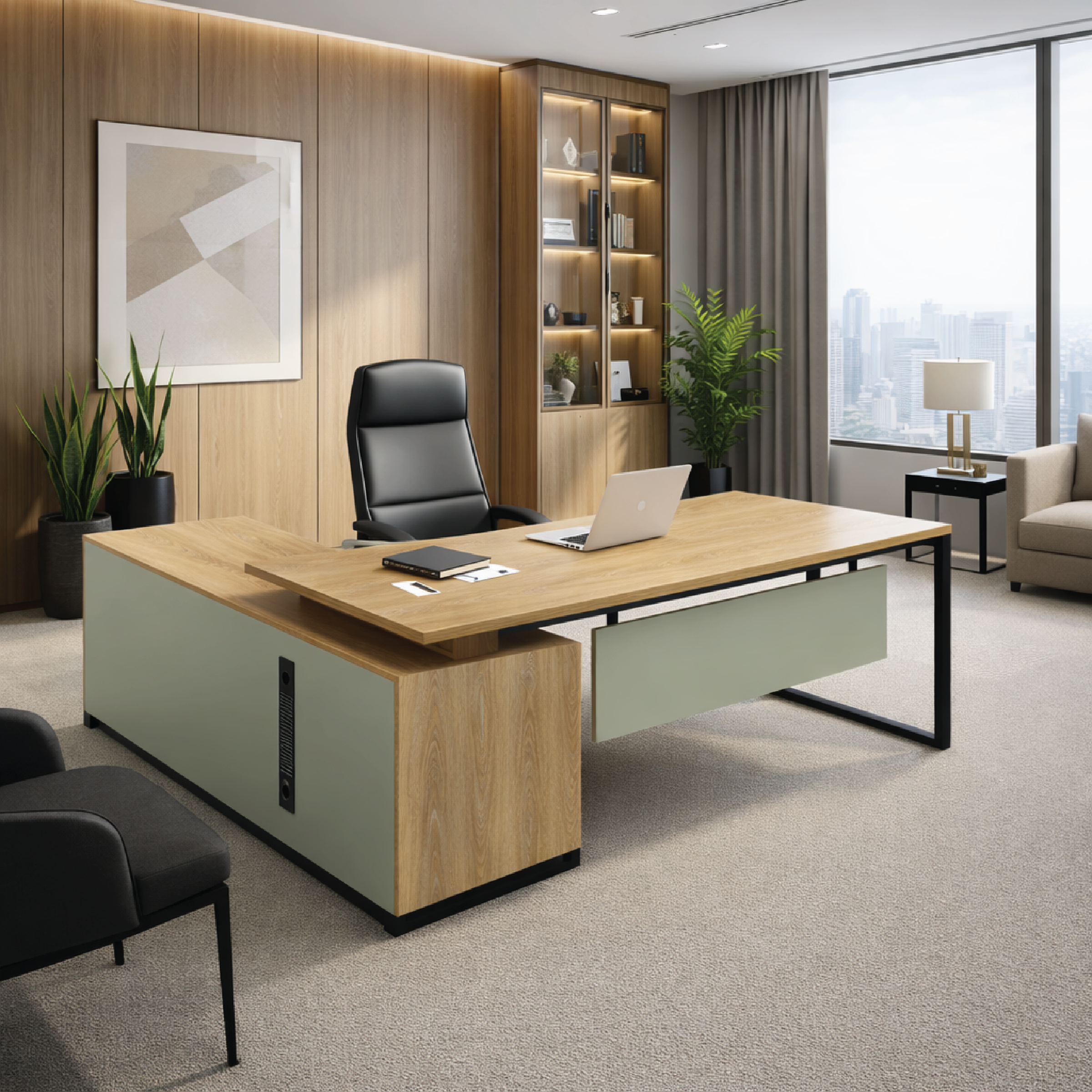 Model 3030 delivers a warm, modern aesthetic with a clean wood-and-metal combination that elevates any executive or managerial office. The smooth melamine surface is resistant to scratches and stains, ensuring long-term appearance and easy maintenance. Its spacious top supports multitasking, while the strong metal frame keeps the desk steady and reliable. Moisture-protected PVC edges and termite-treated board add an extra layer of durability. This model is ideal for anyone seeking a stylish, functional, and budget-friendly executive desk with long-term value.