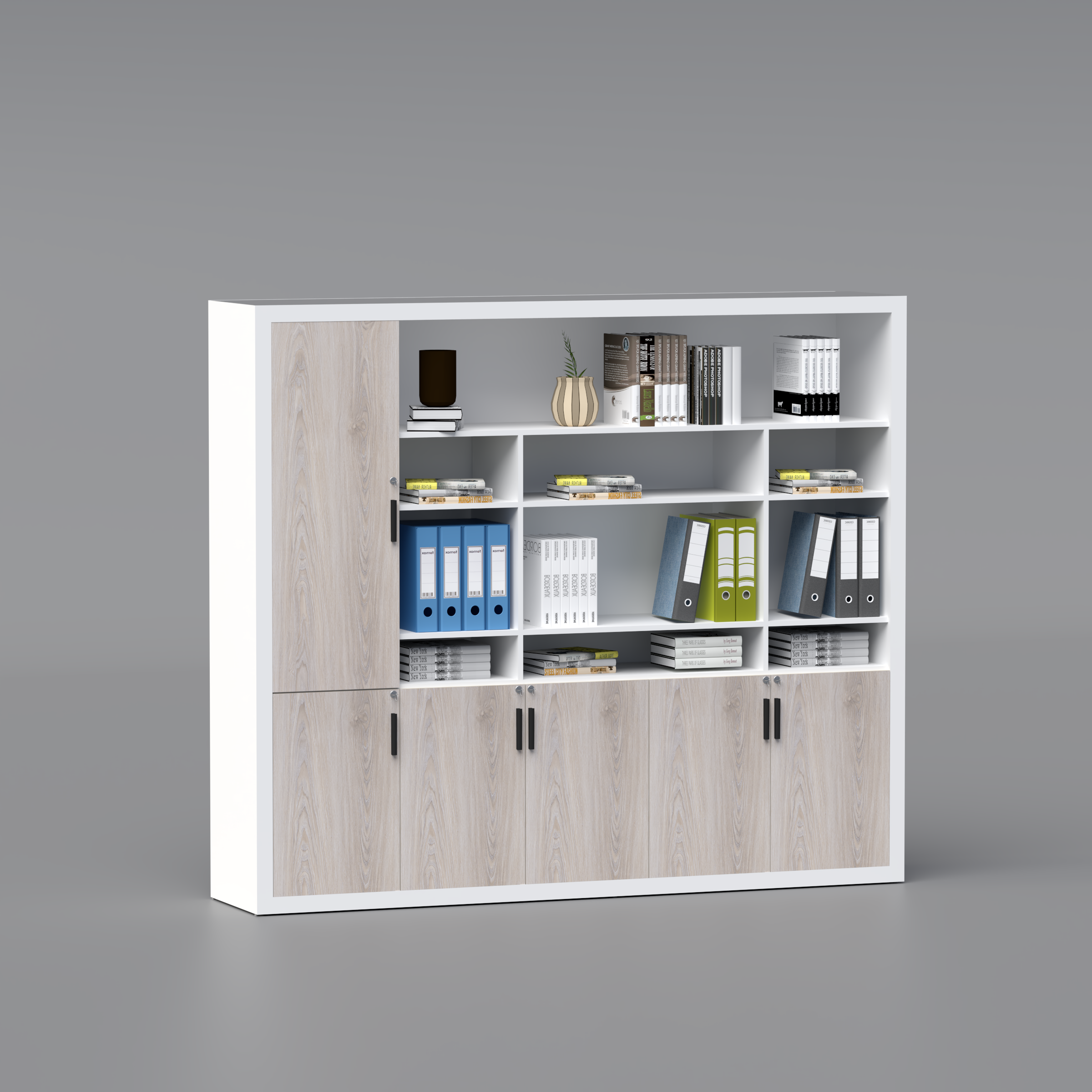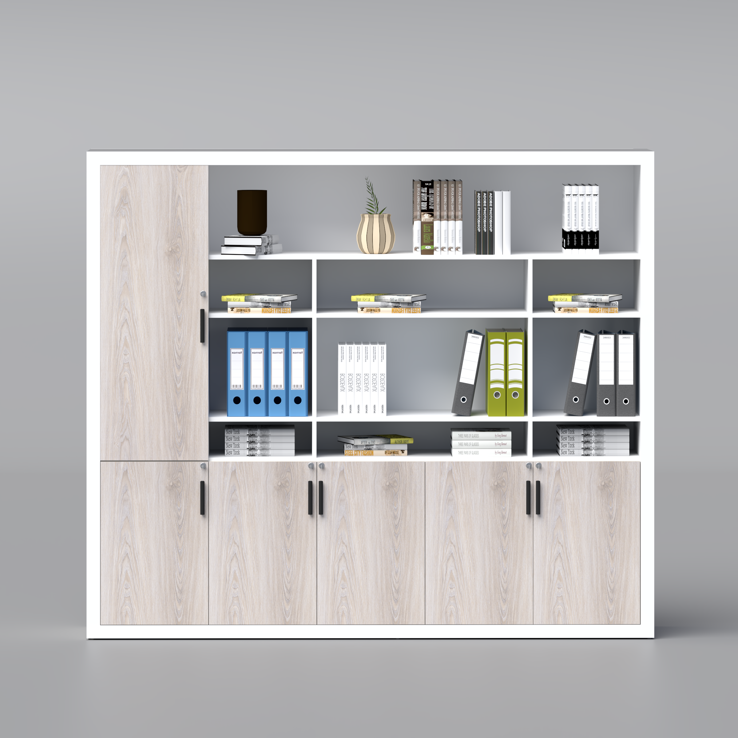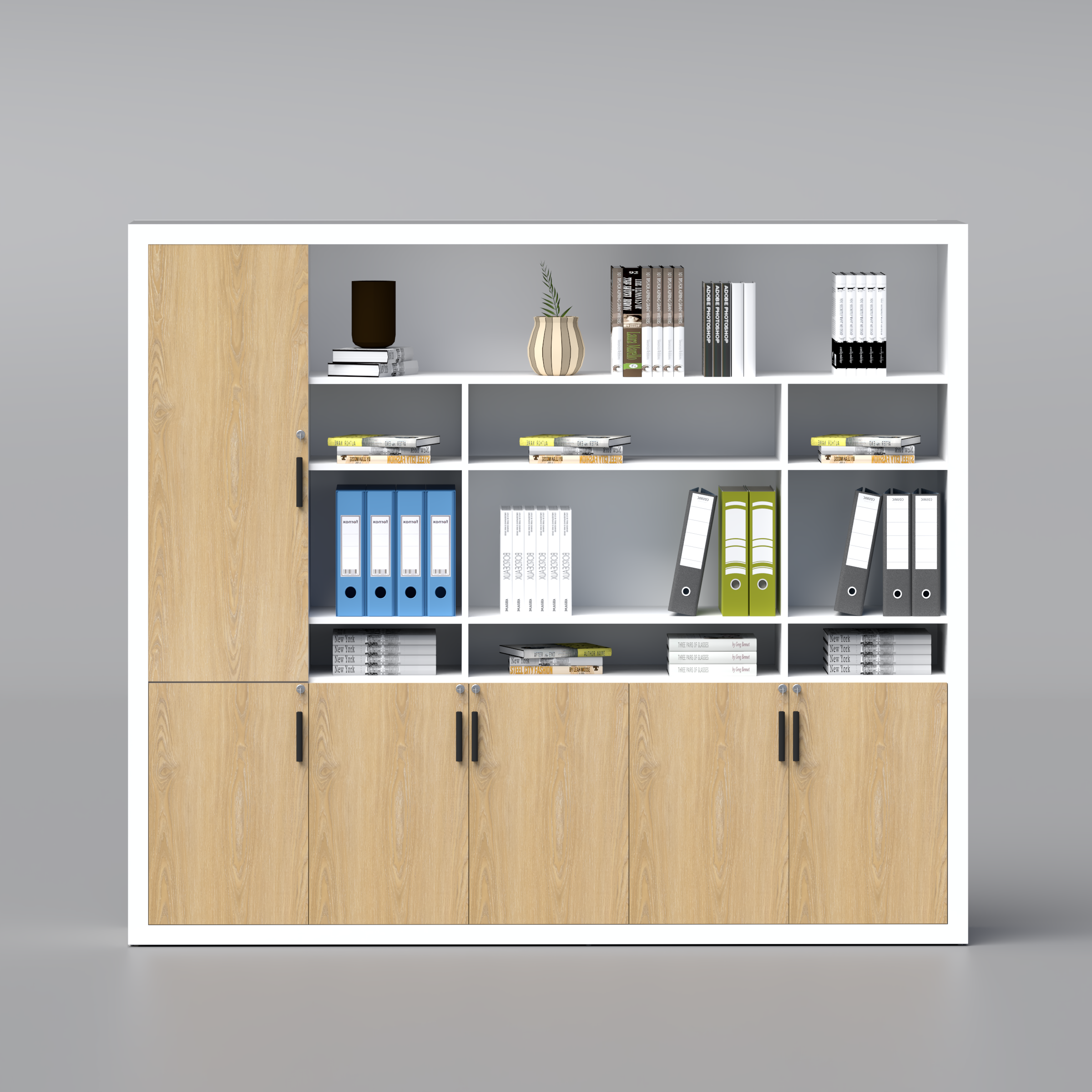 As daylight filters through office windows, it settles gently across the surface of the cabinet. The matte melamine finish softens reflections, keeping the space visually comfortable while maintaining a polished, professional presence. Whether in an executive office, meeting room, or collaborative workspace, it sits quietly in the background, supporting productivity without drawing attention to itself.