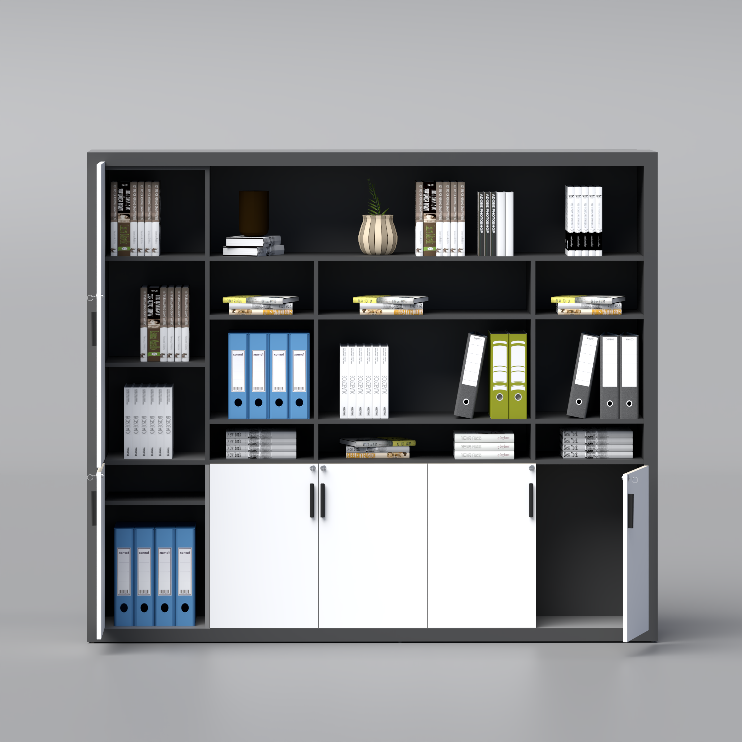 Enclosed cabinet section ideal for confidential documents and sensitive office materials.