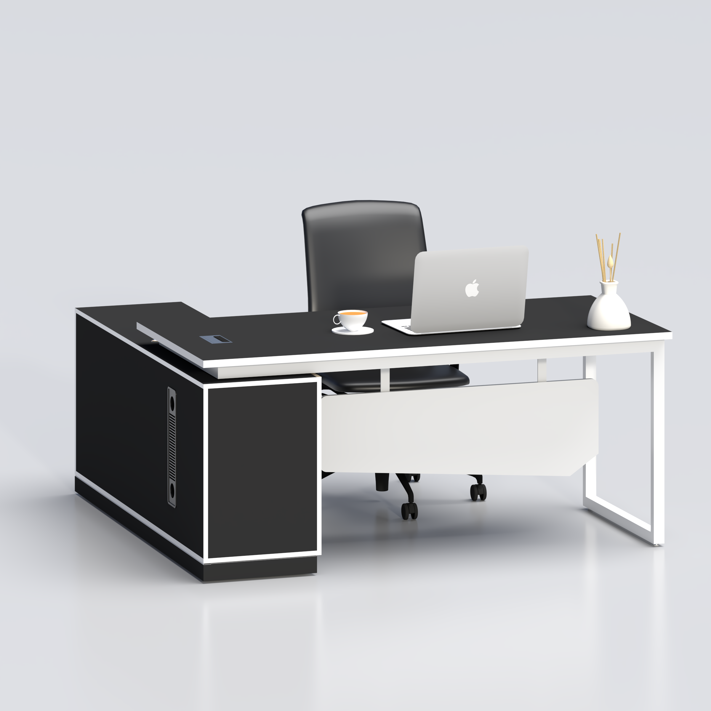An elegant corner-style managerial desk crafted with a premium melamine surface for a smooth and scratch-proof finish. The spacious side cabinet offers practical document storage, making it an excellent choice for corporate offices, startups and executive workrooms. Strong, stylish and built for performance.