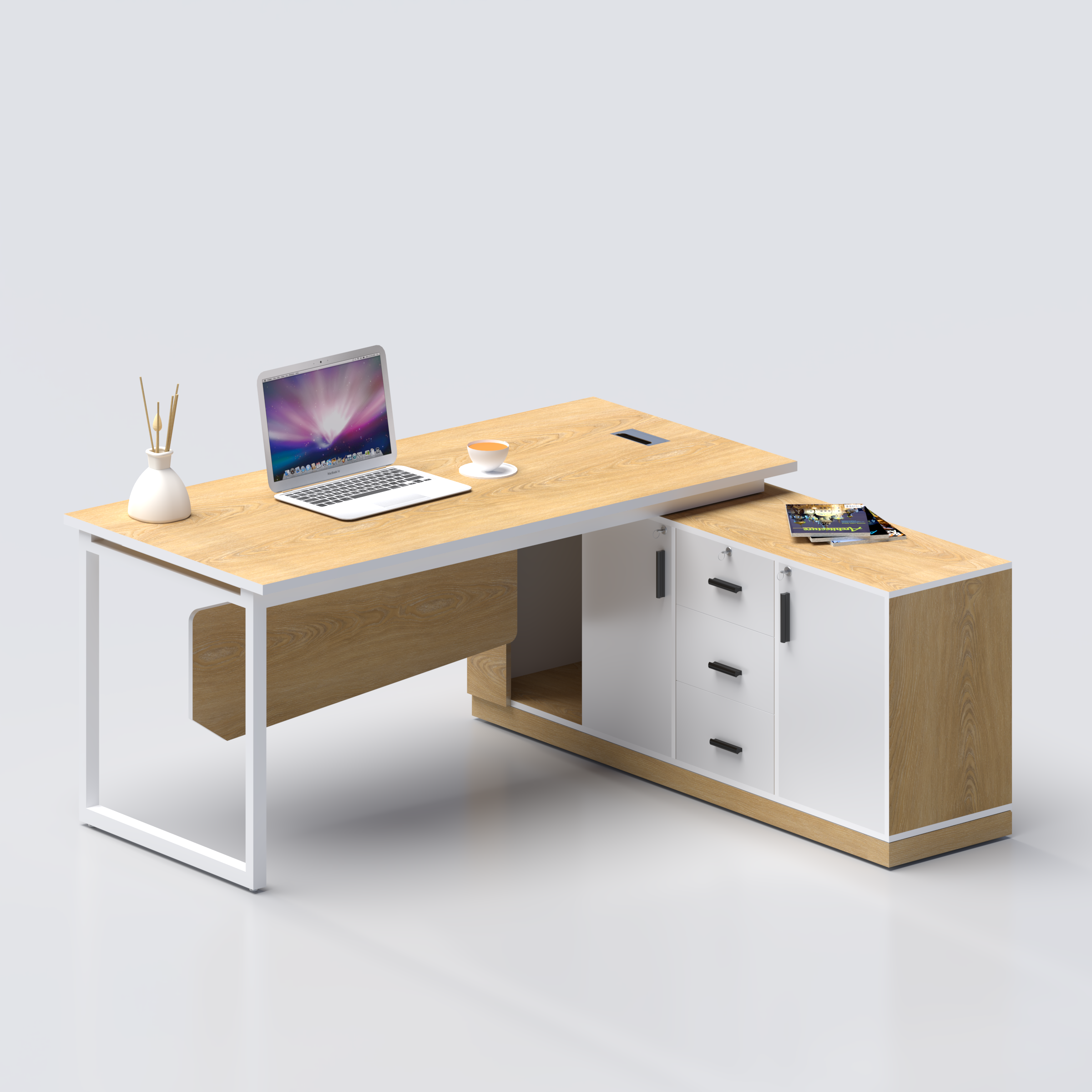 ✔ Cabinet storage keeps workspace clutter-free